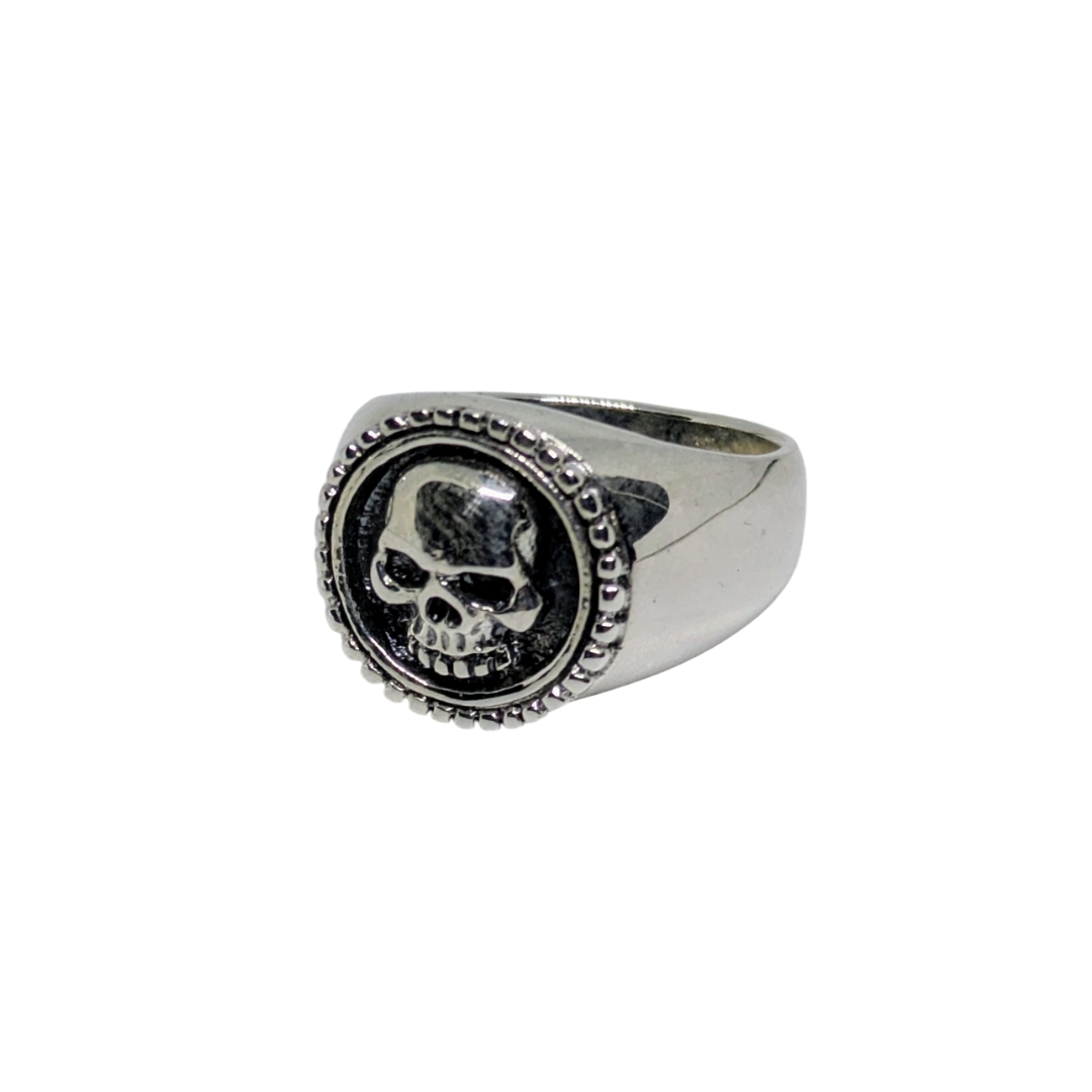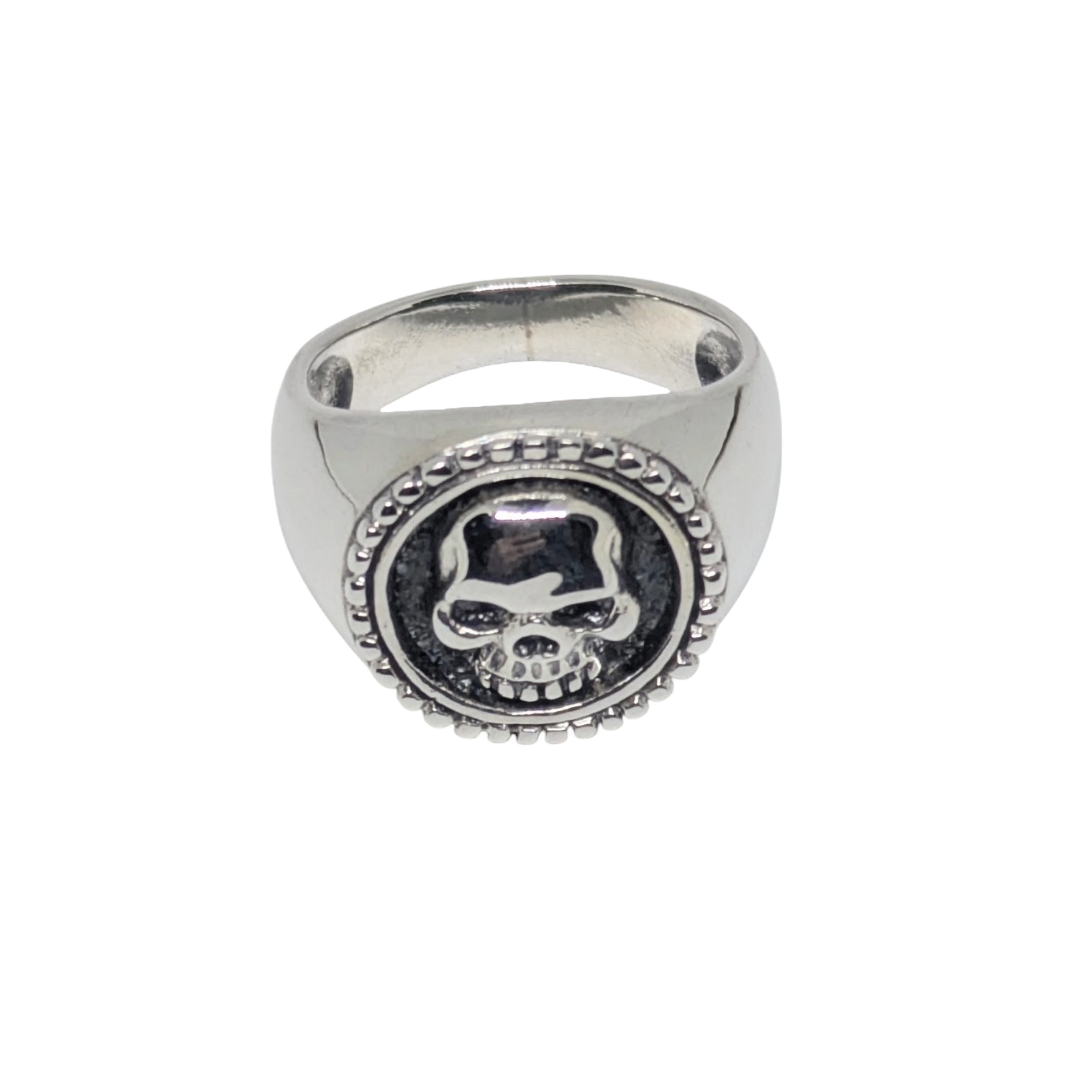 Este anillo de plata es una pieza diseñada que combina la elegancia y el misterio. Su centro muestra una calavera estilizada en relieve, enmarcada por un borde perlado que resalta sus detalles artesanales. Este anillo es el complemento perfecto para quienes buscan expresar su individualidad con un toque de audacia y sofisticación.