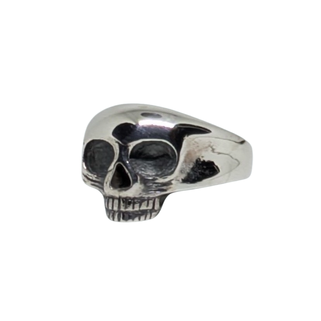 Anillo de plata, presenta una detallada calavera que releja rebeldía. Diseñado para quienes aprecian la estética gótica. su acabado pulido resalta cada detalle con precisión artesanal.