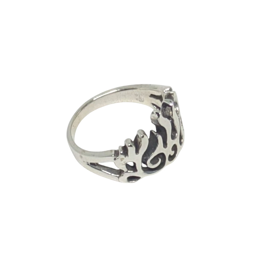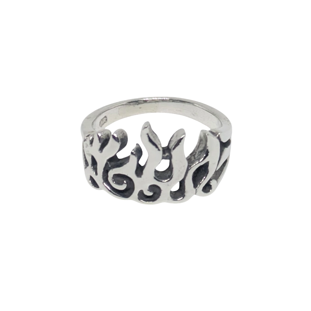 Este anillo de plata presenta un diseño inspirado en llamas estilizadas, la textura envejecida resalta los detalles intrincados del fuego, creando un contraste elegante y audaz