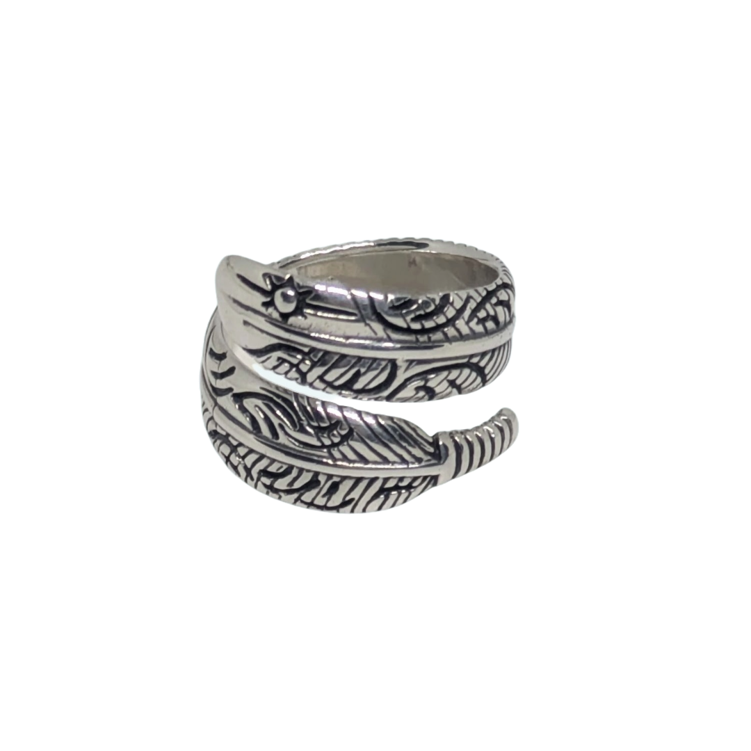 Este anillo de plata de ley .925, esta inspirado en las plumas símbolo sagrado en muchas culturas indígenas americanas. Los grabados detallados le aportan un carácter único, ideal para quienes buscan portar un anillo con significado cultural y espiritual.