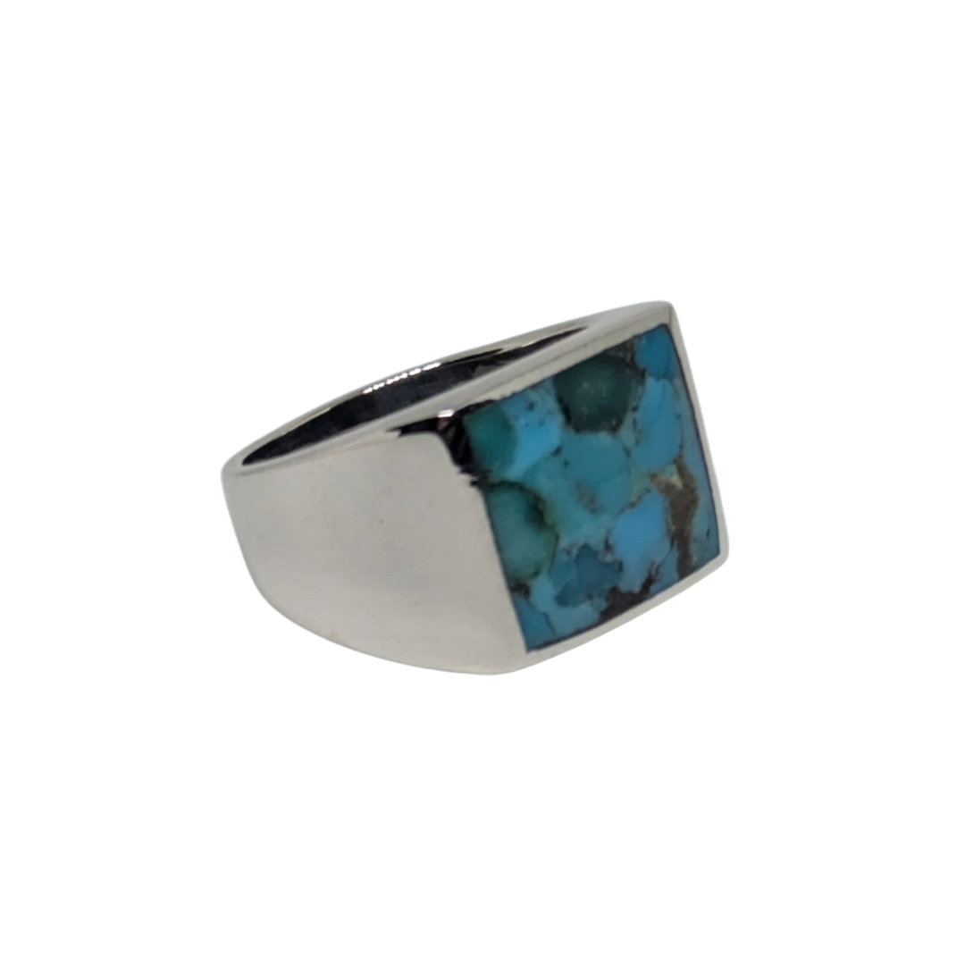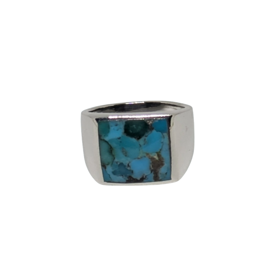 Este sello esta elaborado en plata de ley 925 y presenta una hermosa incrustación de turquesa natural con vetas únicas, lo que lo0 convierte en una pieza exclusiva.