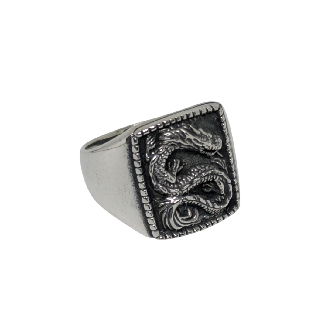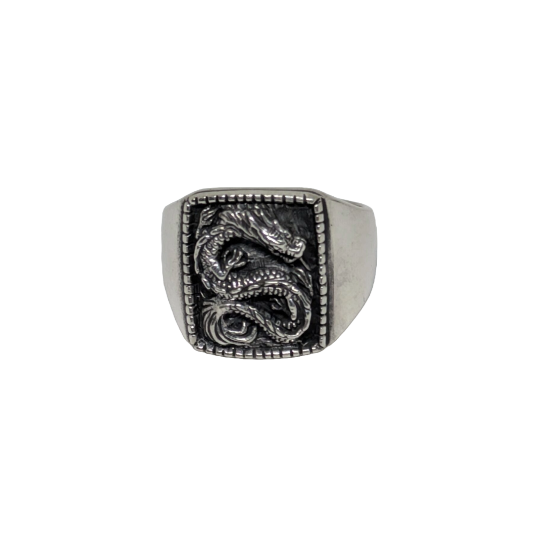 Este sello de plata de ley ,925 esta diseñado para destacar, cuenta con un intrincado grabado de un dragón, simbolo de protección, sabiduría y fortaleza. Su estructura robusta y resistente asegura durabilidad, mientras que su diseño clásico y elegante lo convierte en el complemento perfecto para cualquier estilo. Hazlo tuyo y lleva contigo la esencia del dragón.