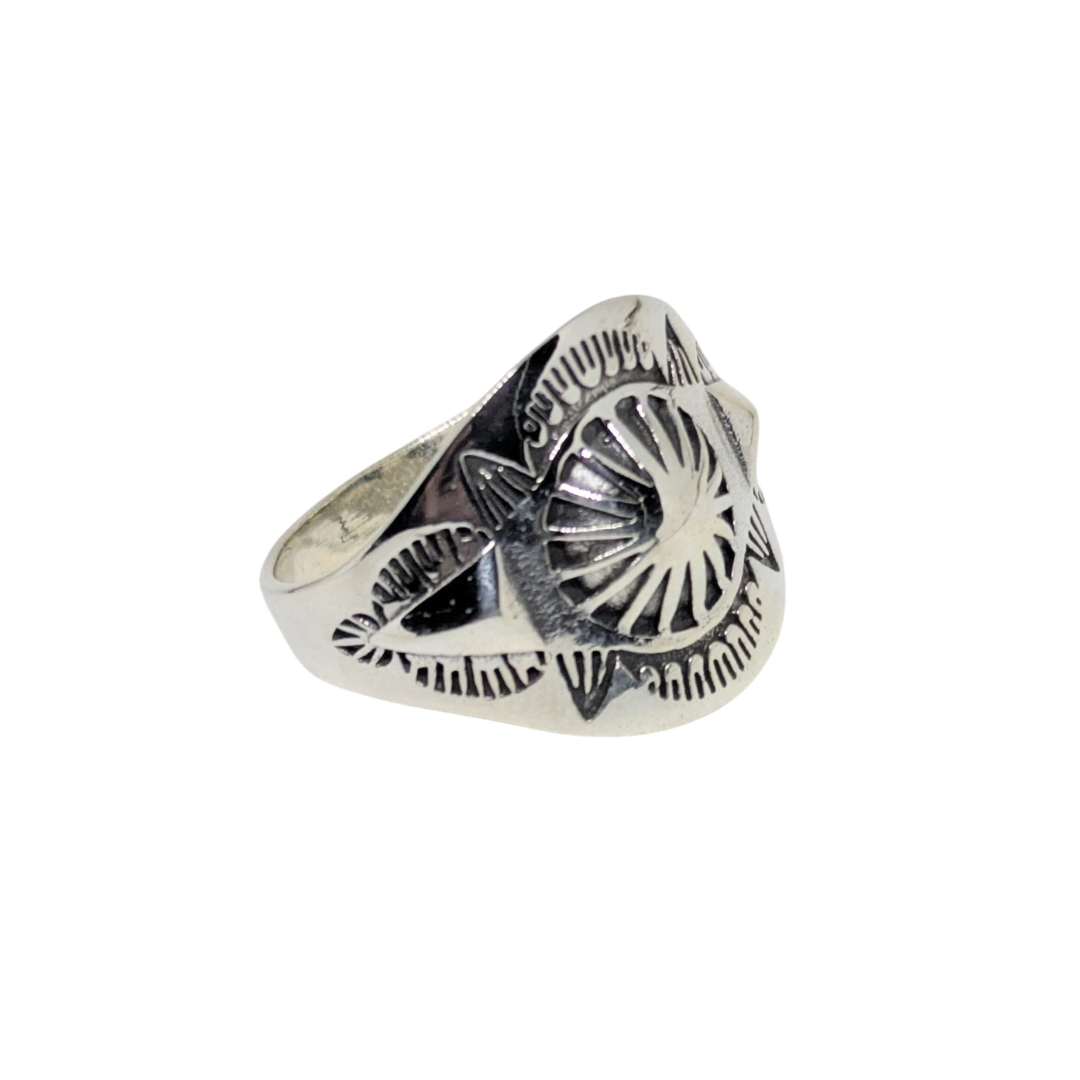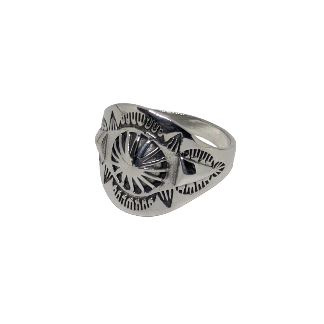Este anillo de plata destaca por su diseño inspirado en el sol. Los detalles grabados a mano resaltan la artesanía y el estilo único de esta pieza. Perfecto para quienes buscan un accesorio con significado y estilo atemporal.