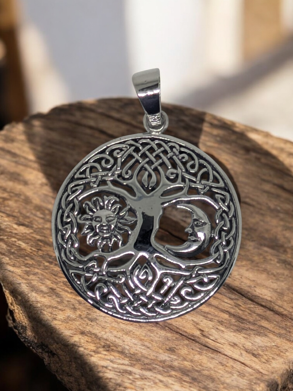 Este colgante de plata simboliza fuerza, crecimiento y equilibrio. Sus profundas raices conectan con la tierra, mientras el sol y la luna en el centro representan la dualidad y la armonia del universo. Un diseño para quienes valoran la conexion con la naturaleza