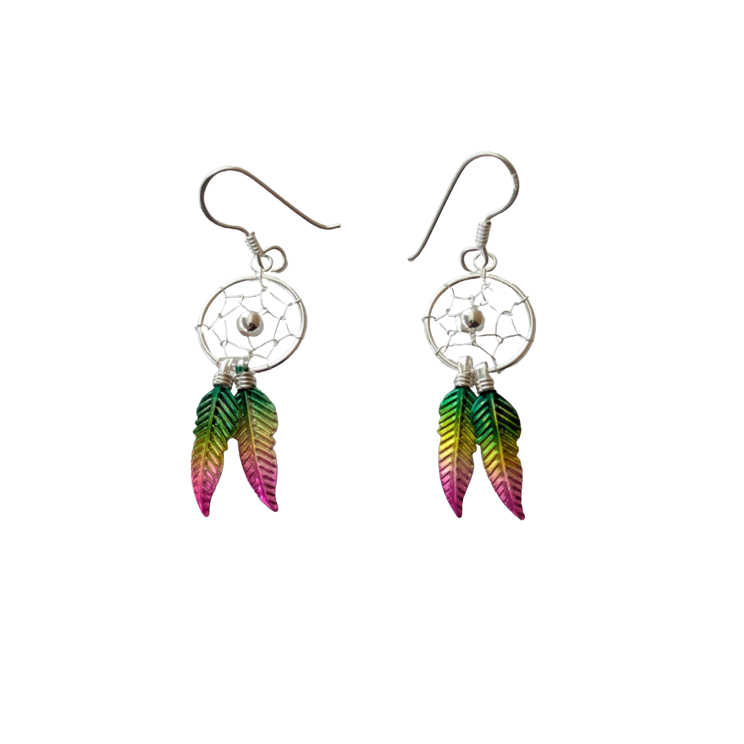 Estos pendientes de plata están inspirados en el diseño tradicional del atrapasueños, con detalles cuidadosamente entretejidos que simulan la red central. El atrapasueños en un símbolo ancestral de la cultura nativa americana, utilizado para proteger de las malas energías y permitir que solo los buenos sueños lleguen al durmiente. La red atrapa las pesadillas, mientras que las plumas actúan como canal por donde descienden lo sueños positivos.