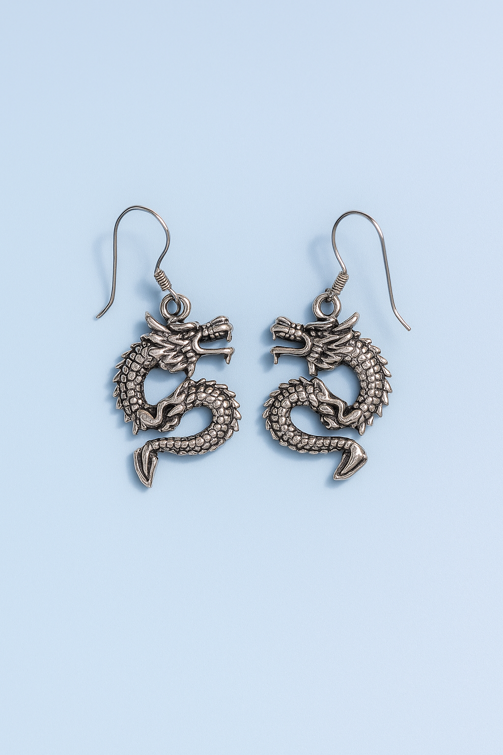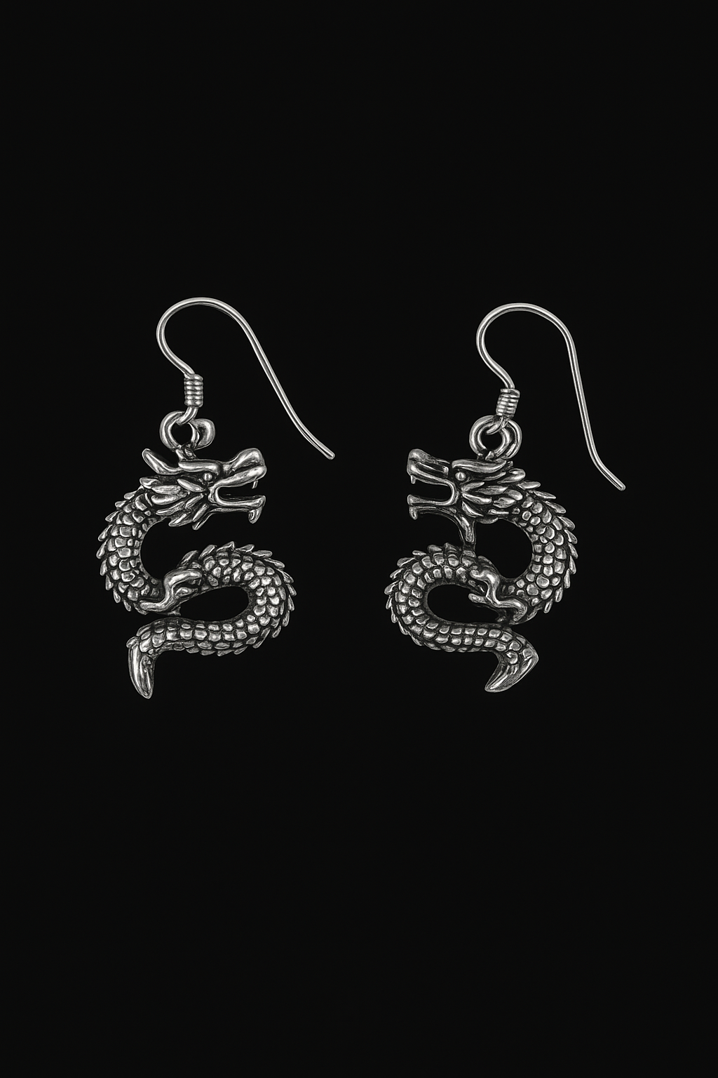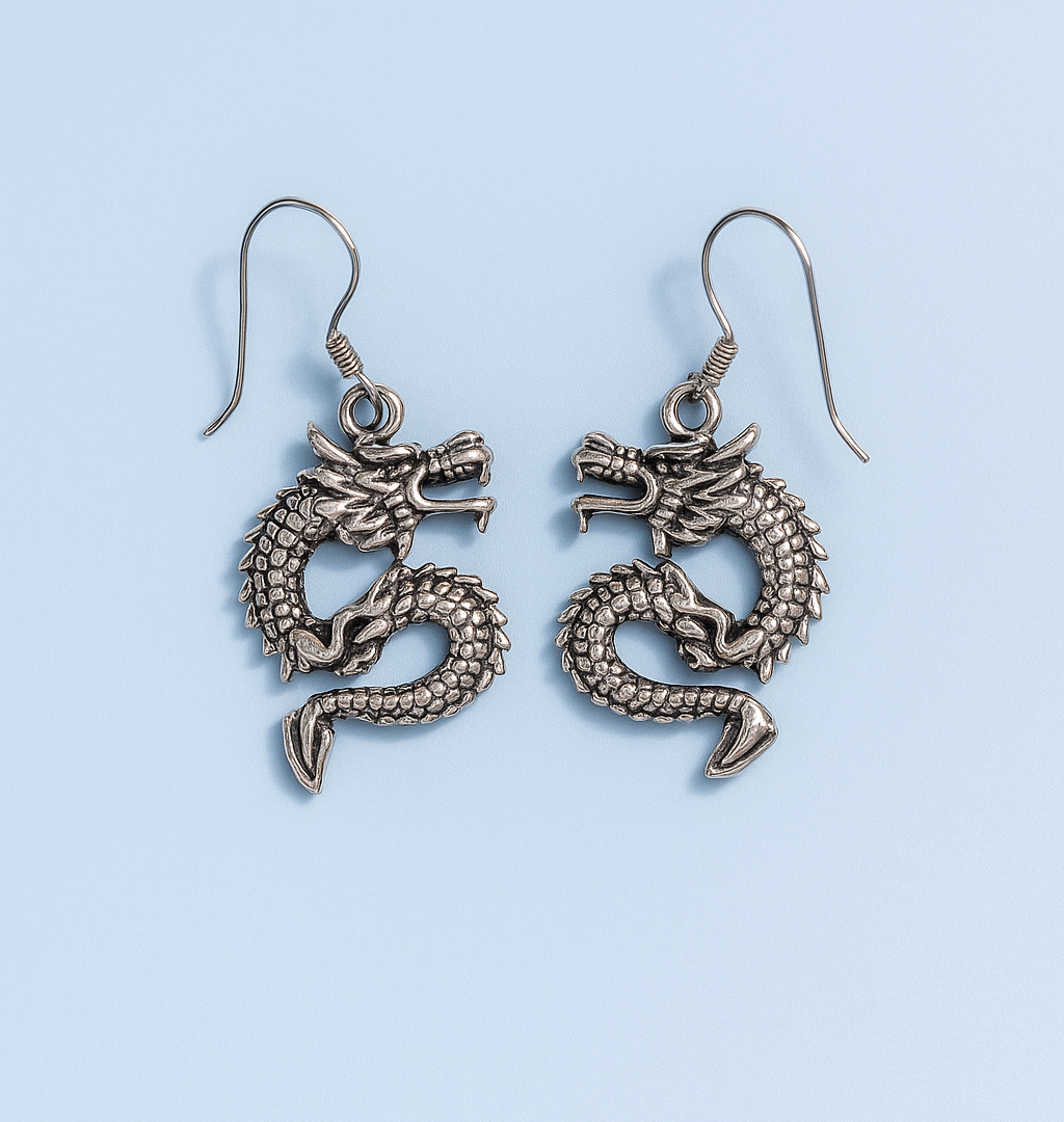 Pendientes de plata con diseño de Dragon, simbolo de fuerza sabiduria y protección. Cada detalle del dragón está finamente trabajado, desde sus escamas hasta sus garras logrando un acabado artesanal de alta calidad .