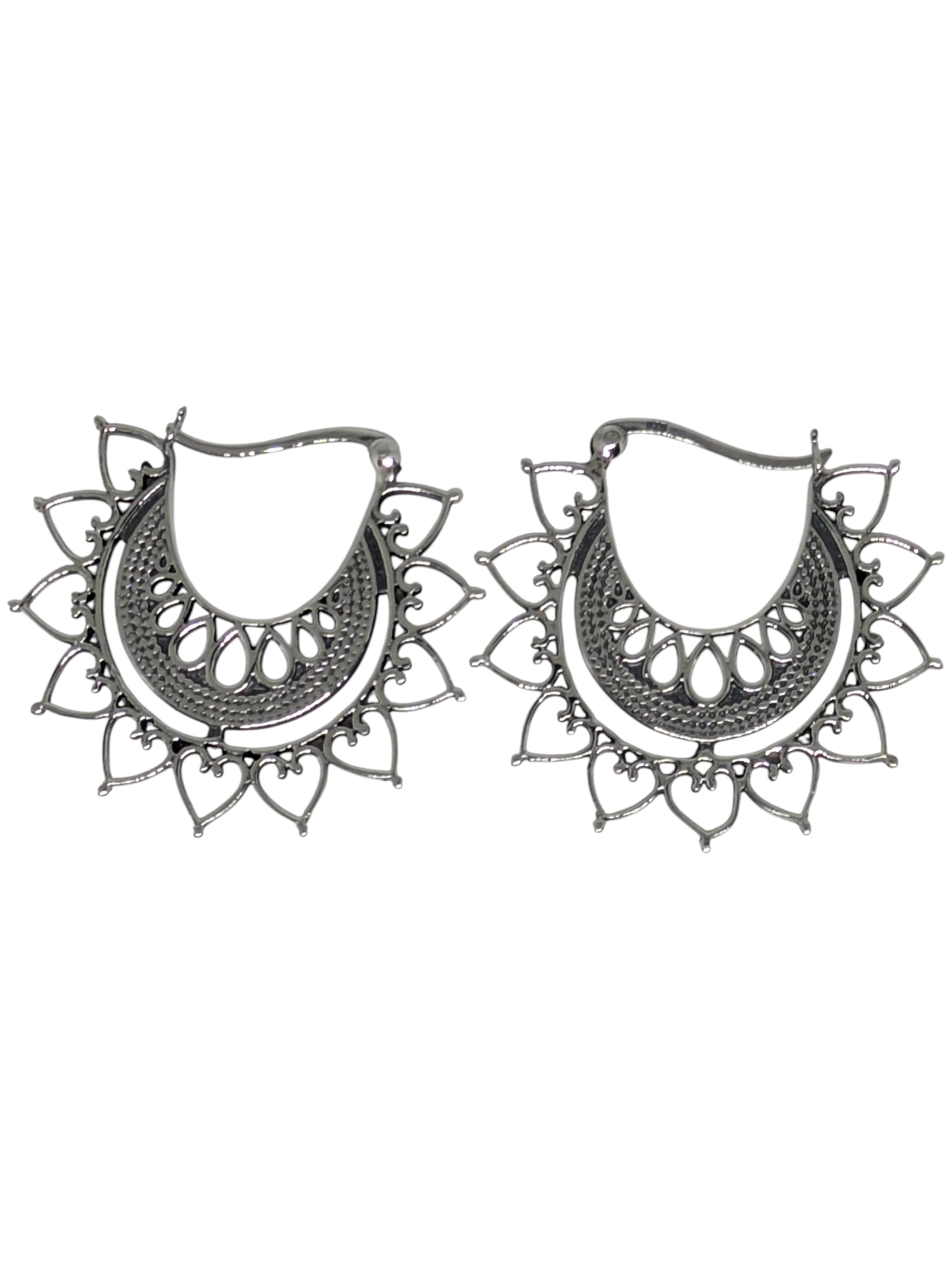 Forma Circular con Puntas Estilizadas, representa un diseño solar. El uso de calados y pequeños detalles refleja técnicas de orfebrería meticulosa. Esta fabricado con plata ,925 miden 3,5 cm de diametro incluyendo las formas en rayo de sol, tiene cierre de palanca también conocido como cierre tipo arnés