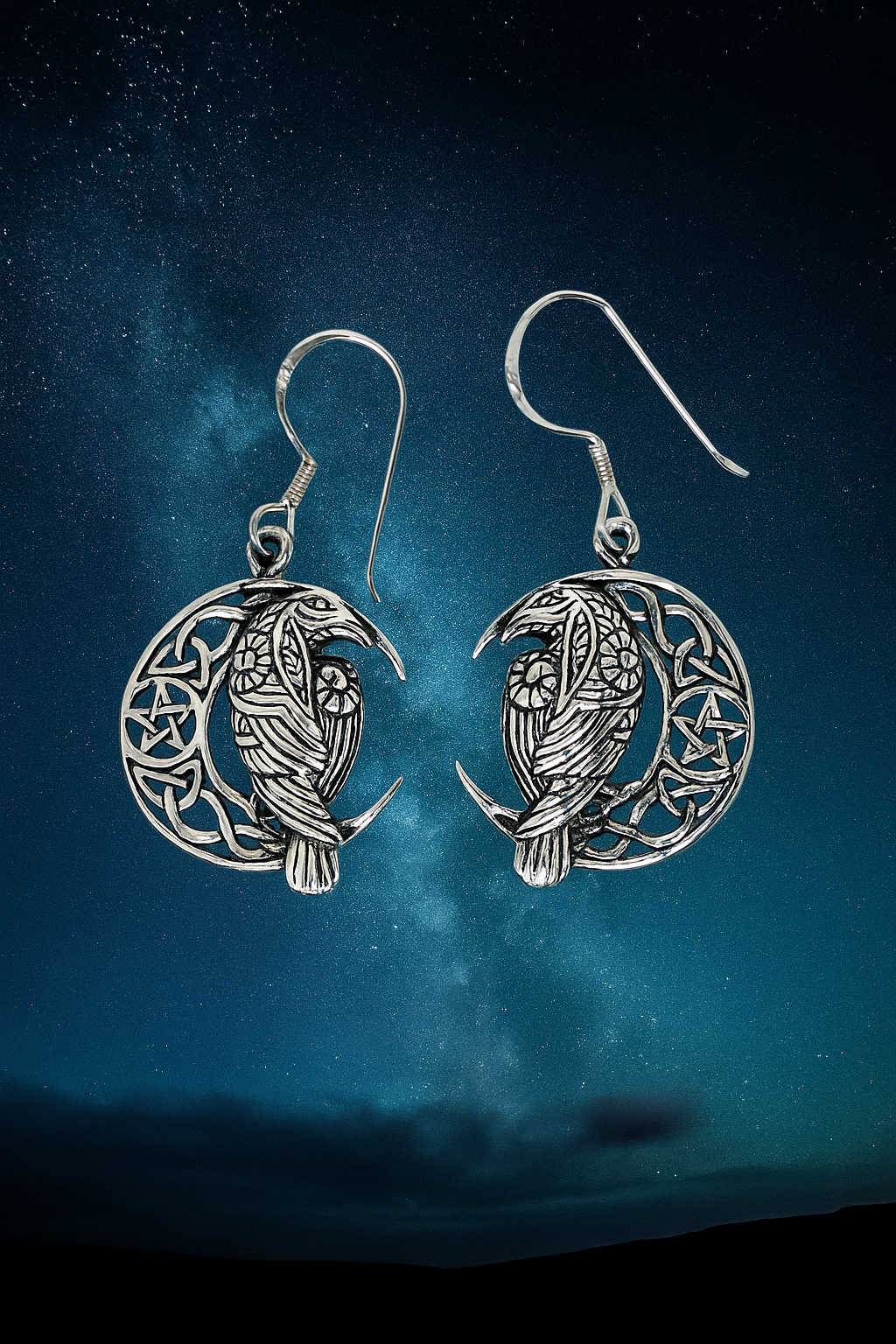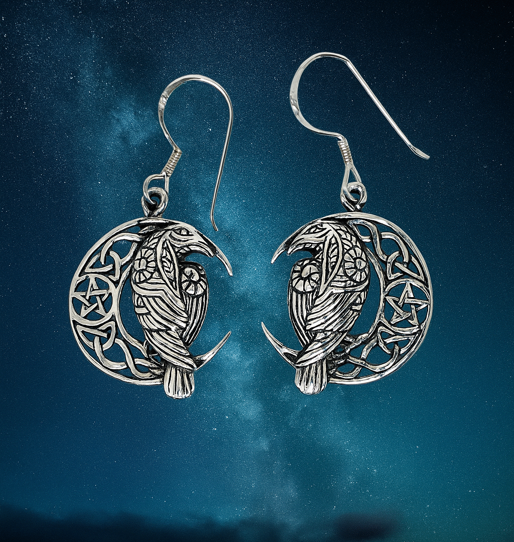 Pendientes de plata con media Luna y Cuervo – Misticismo y Sabiduria