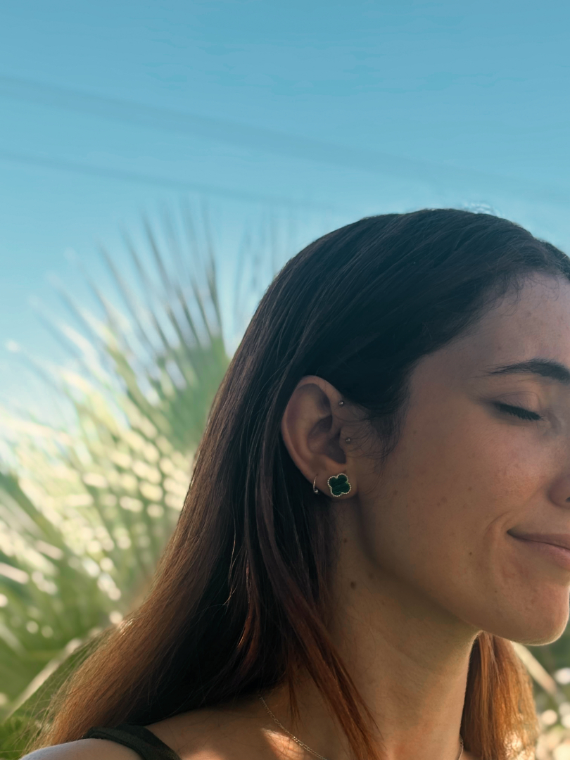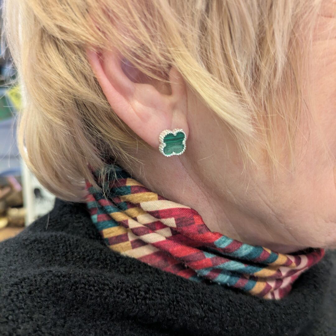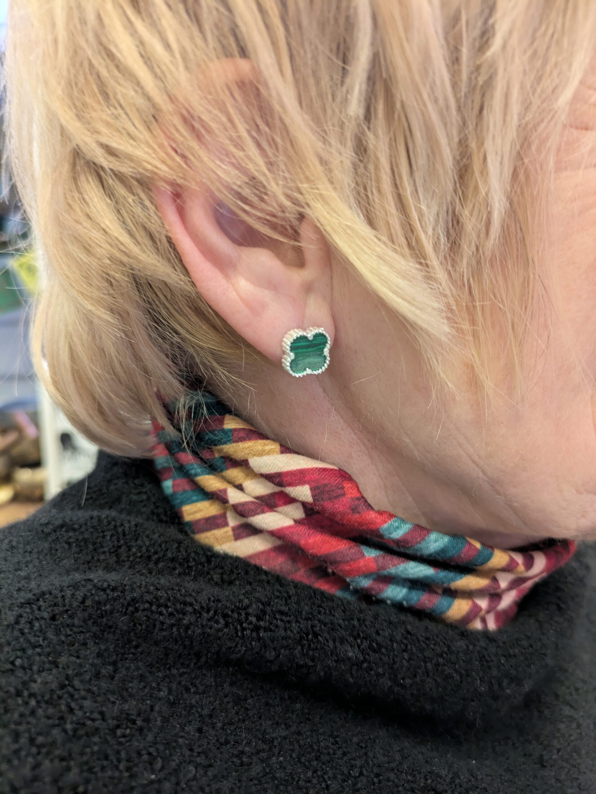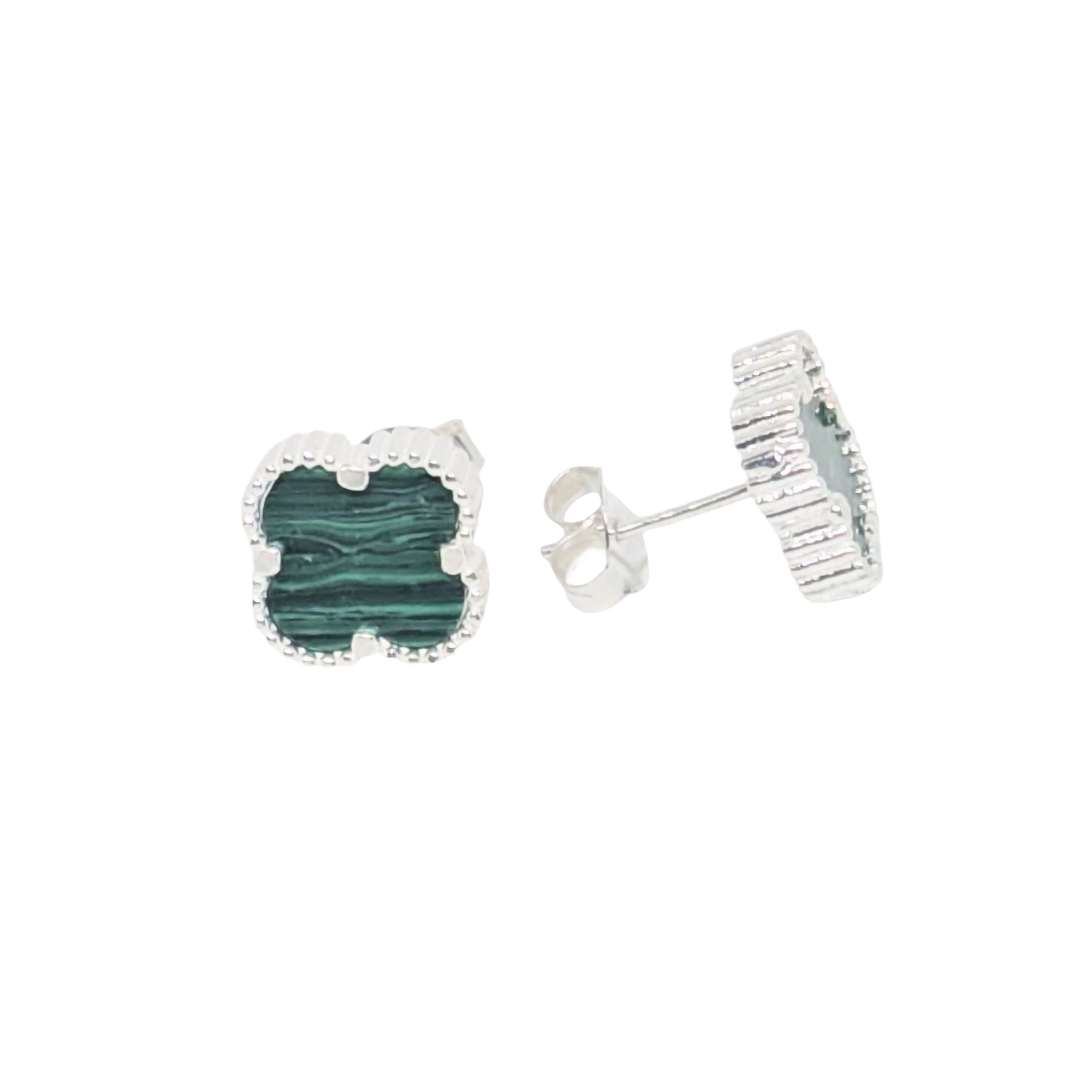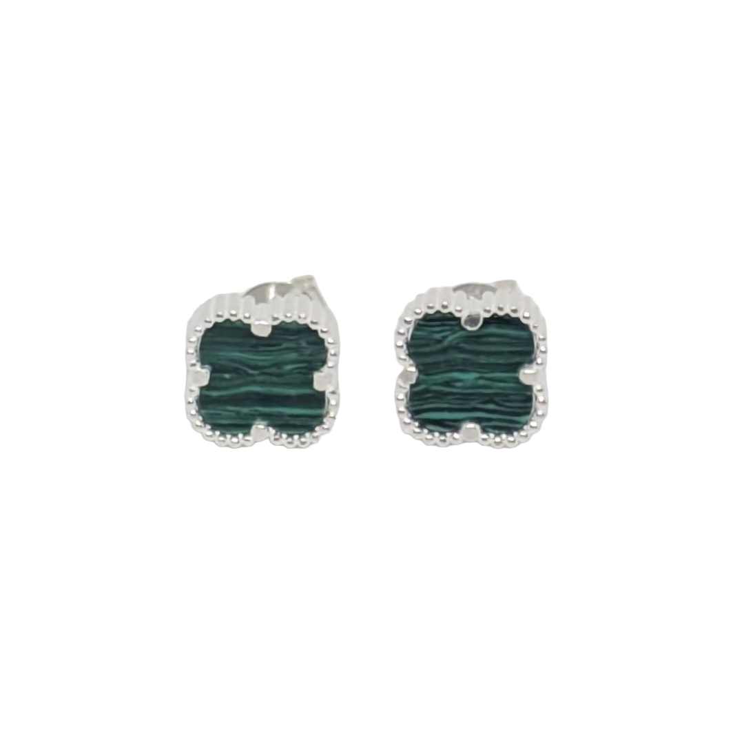 Pendientes de plata tienen un tono característico y un diseño trabajado en los bordes y el centro color malaquita, son de tipo botón o stud, con cierre de mariposa tambien conocido como cierre de presión.
