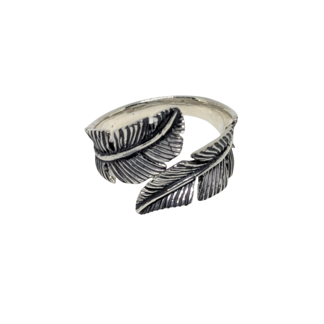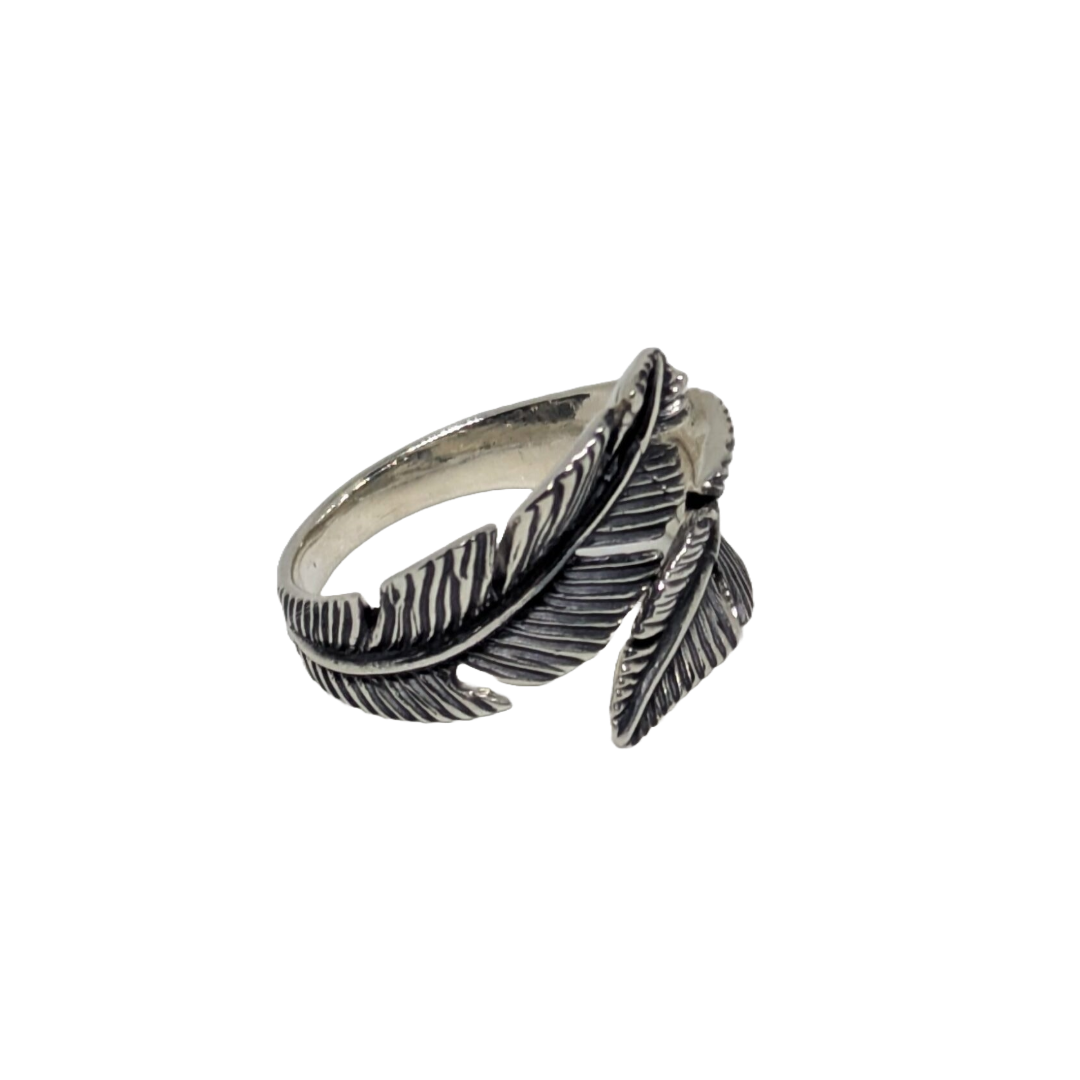 Este Anillo de plata de ley 925 presenta un diseño detallado de plumas, con un acabado envejecido que le da un estilo rustico y elegante.