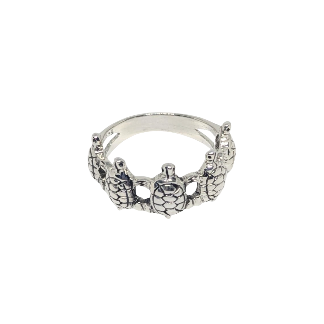 Anillo elaborado en plata .925 con un diseño detallado de tortugas alrededor de la banda. Cada tortuga esta cuidadosamente esculpida con detalles en el caparazón y la cabeza creando un estilo único.