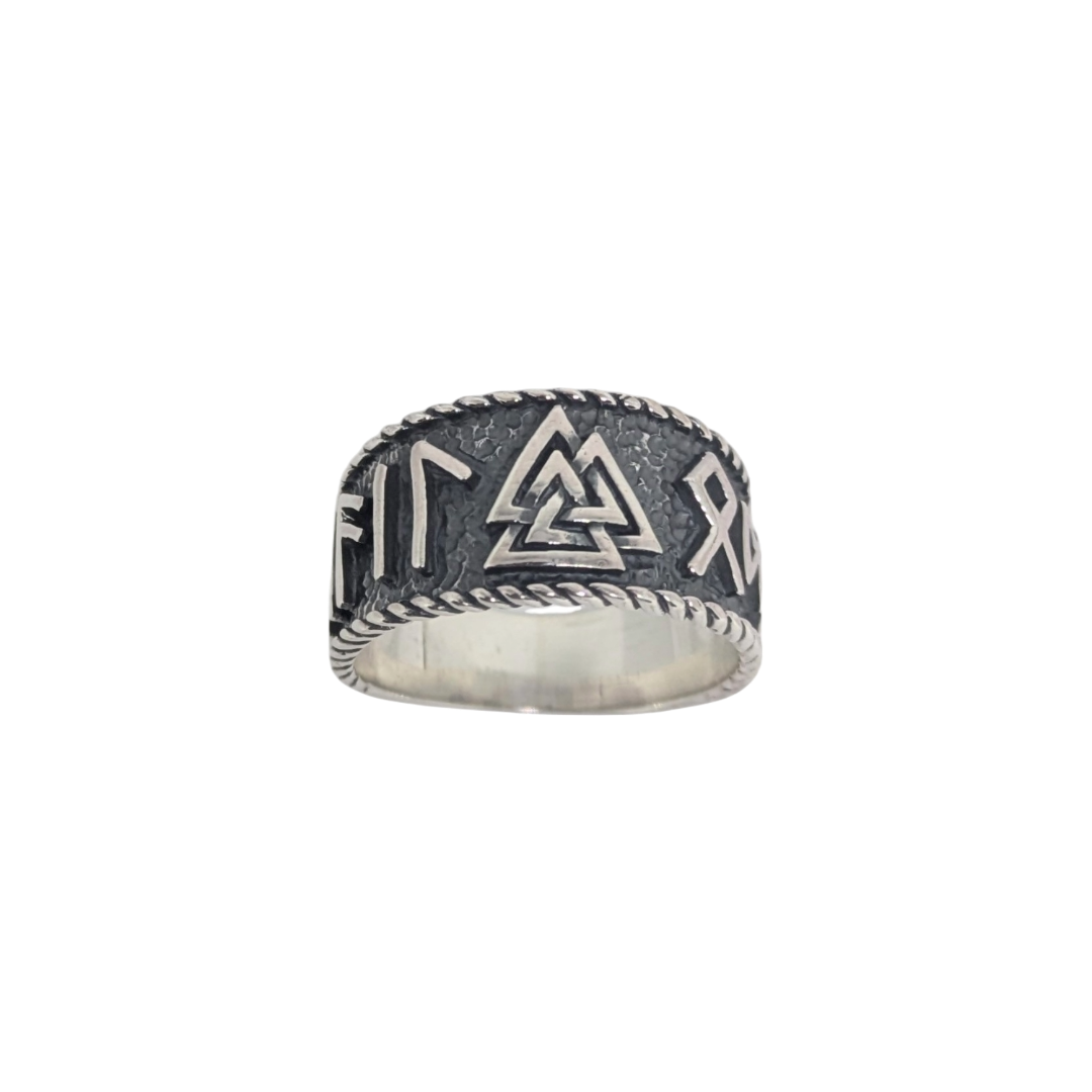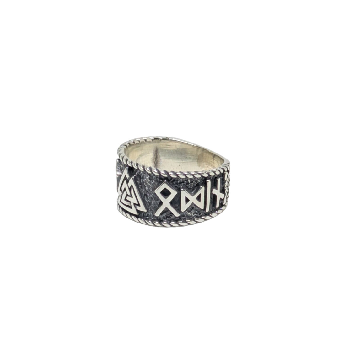 En el centro del anillo en relieve se encuentra el Valknut, el icónico símbolo de los tres triángulos entrelazados, asociado con Odín y la muerte en la batalla, en el borde borde del anillo, corre un circulo de runas en relieve. Estas runas pueden ser decorativas o formar una inscripción con significado como bendición, un mensage de protección o una referencia a la mitología nórdica.